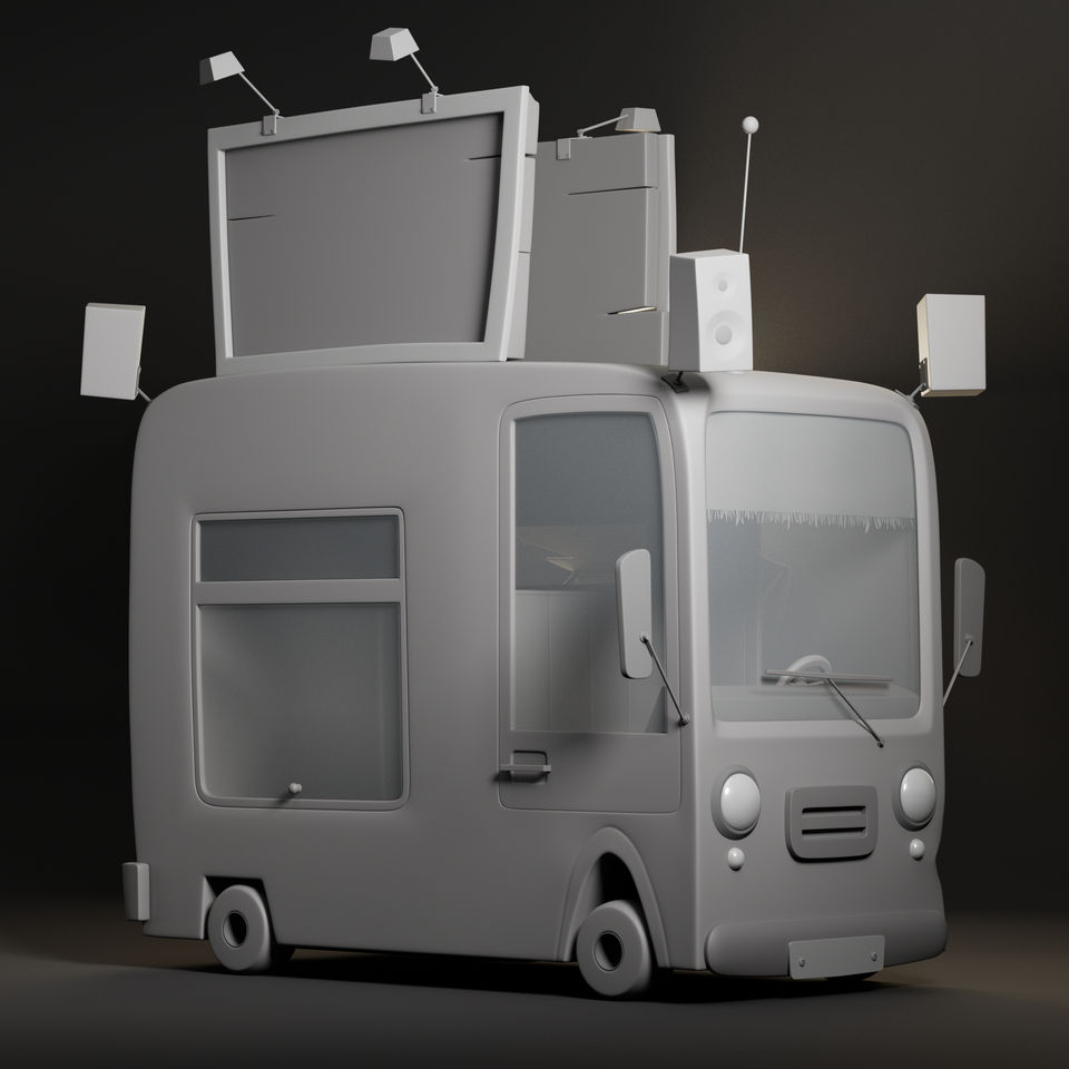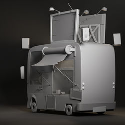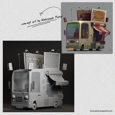 I’ve really been having fun exploring hard surface modeling, and this beautiful, stylized food truck is based on the concept art by Aleksandr Pushai.